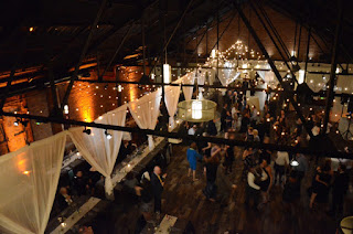 String Lights hanging in two circular/star shape patterns with round clear G50 bulbs between the 1st and 4th beam at 26 Bridge. String Lights hanging vertically with round white G50 Bulbs as a backdrop behind the ceremony area at 26 Bridge. Amber Up-Lights around the perimeter of the main room.